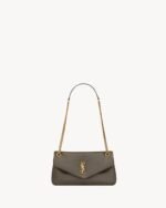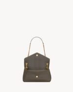 Featuring a sliding chain strap, the bag may be worn on the shoulder or crossbody.