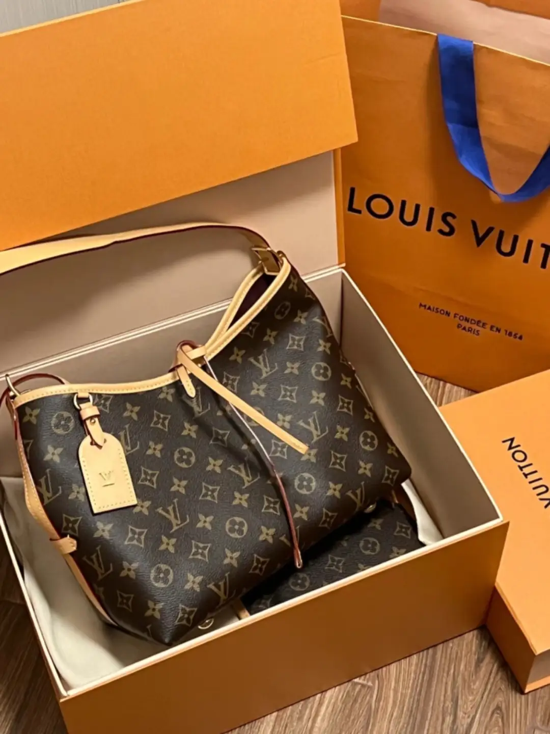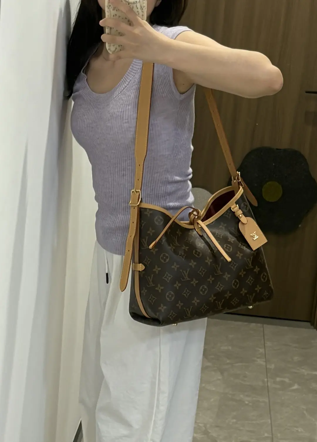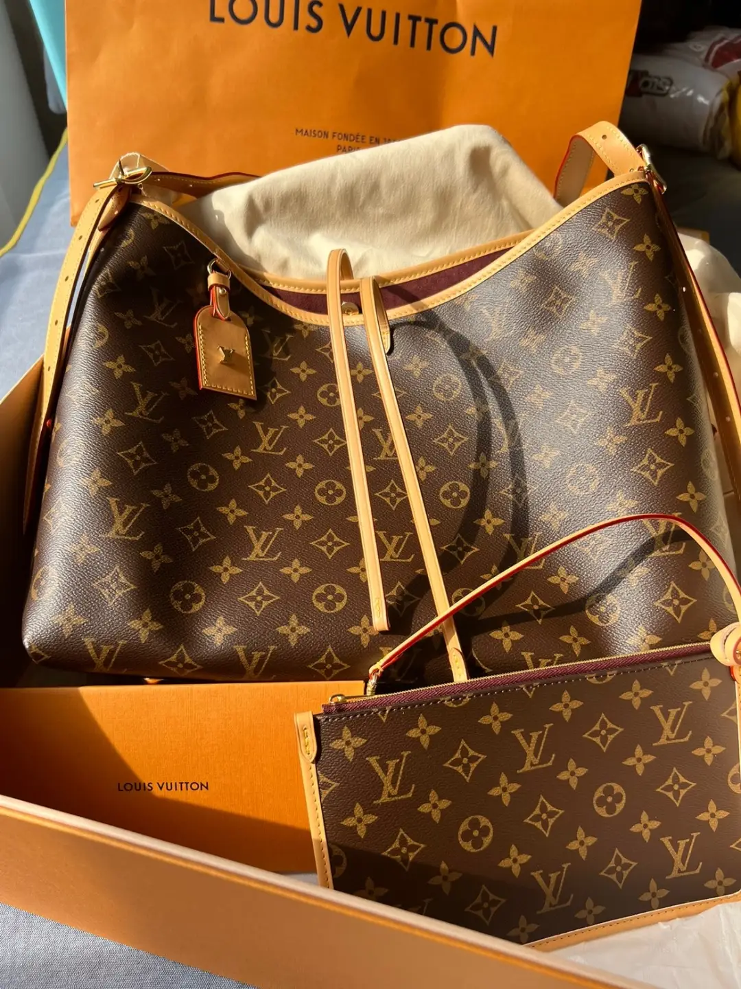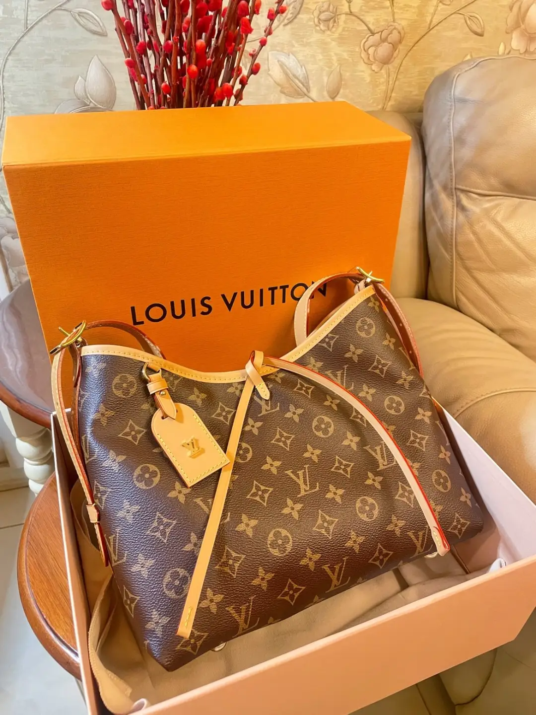 Louis Vuitton launches the CarryAll MM handbag in Monogram canvas with natural leather trim. Its contemporary, body-friendly design and roomy interior make this a fantastic everyday bag. Inside zipped pockets and a removable zipped pouch deliver even more functionality. A gold-color buckle allows the handle to be shortened or lengthened.