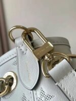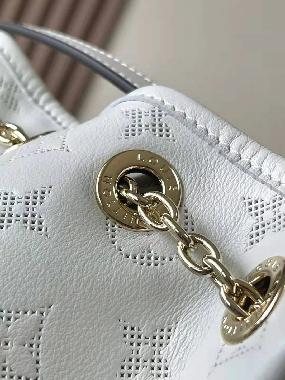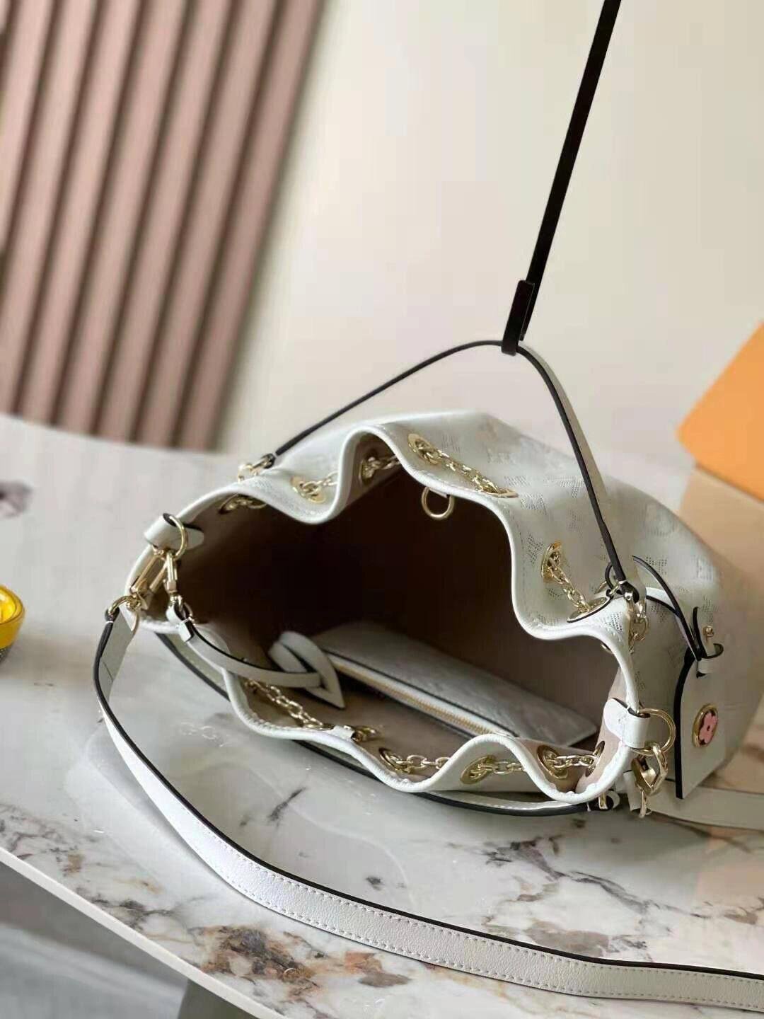 A new embossing technique makes the calfskin of this LV Bundle bag look like it’s perforated with the Monogram pattern but, in fact, it’s embossing. The feminine colorway and pale-gold-color hardware bring an up-to-the-minute feel. The bag is embellished with a leather name tag, featuring a Monogram Flower charm.