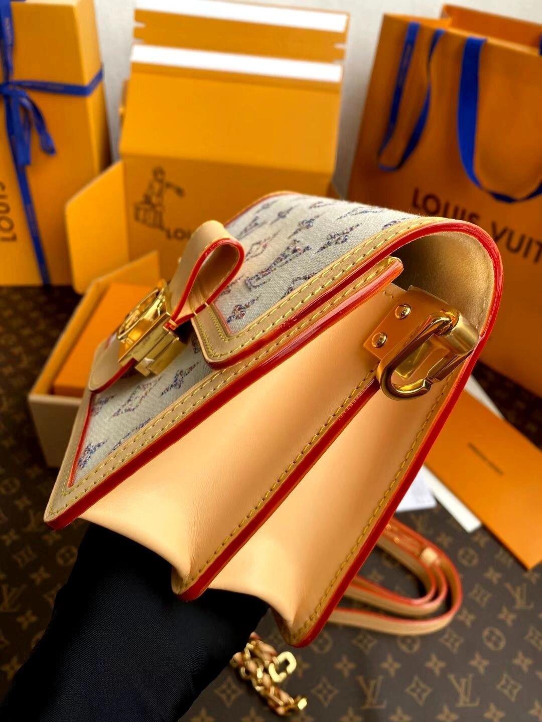Part of the Nautical capsule, this Mini Dauphine is adorned with multicolor LVs and Monogram Flowers. The jacquard motif is created through a weave using 66 different-colored threads to produce a delicate gradient of color. The fabric then receives a protective coating. The bag features a braided chain and a leather strap – both detachable.