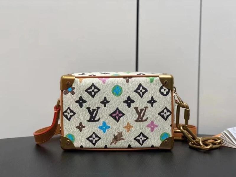 The fusion of tradition and modernity, this Mini Soft Trunk bag is fashioned from Monogram Craggy canvas. The Monogram takes on a hand-drawn feel and includes daisies and dogs in addition to Monogram Flowers and LVs. The chain connected to the adjustable strap is a golden hue as the decorative chain on the front zipper.