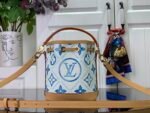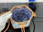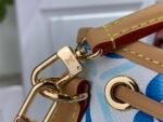 The Nano Noé bag is revisited with a Mediterranean-style Monogram Tiles print on coated canvas as part of the LV By the Pool collection, which evokes travel to sunny destinations. Leather trim complements this design, notably on the removable top handle and removable, adjustable shoulder strap, which offer different carry options.