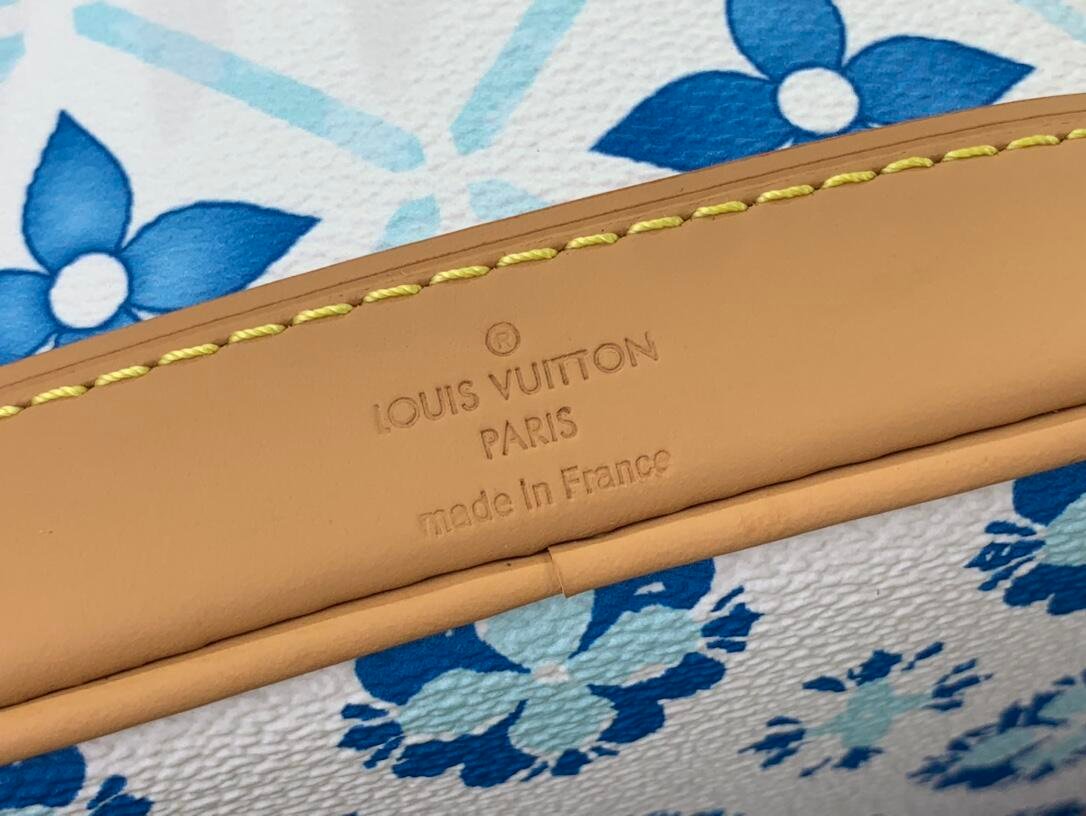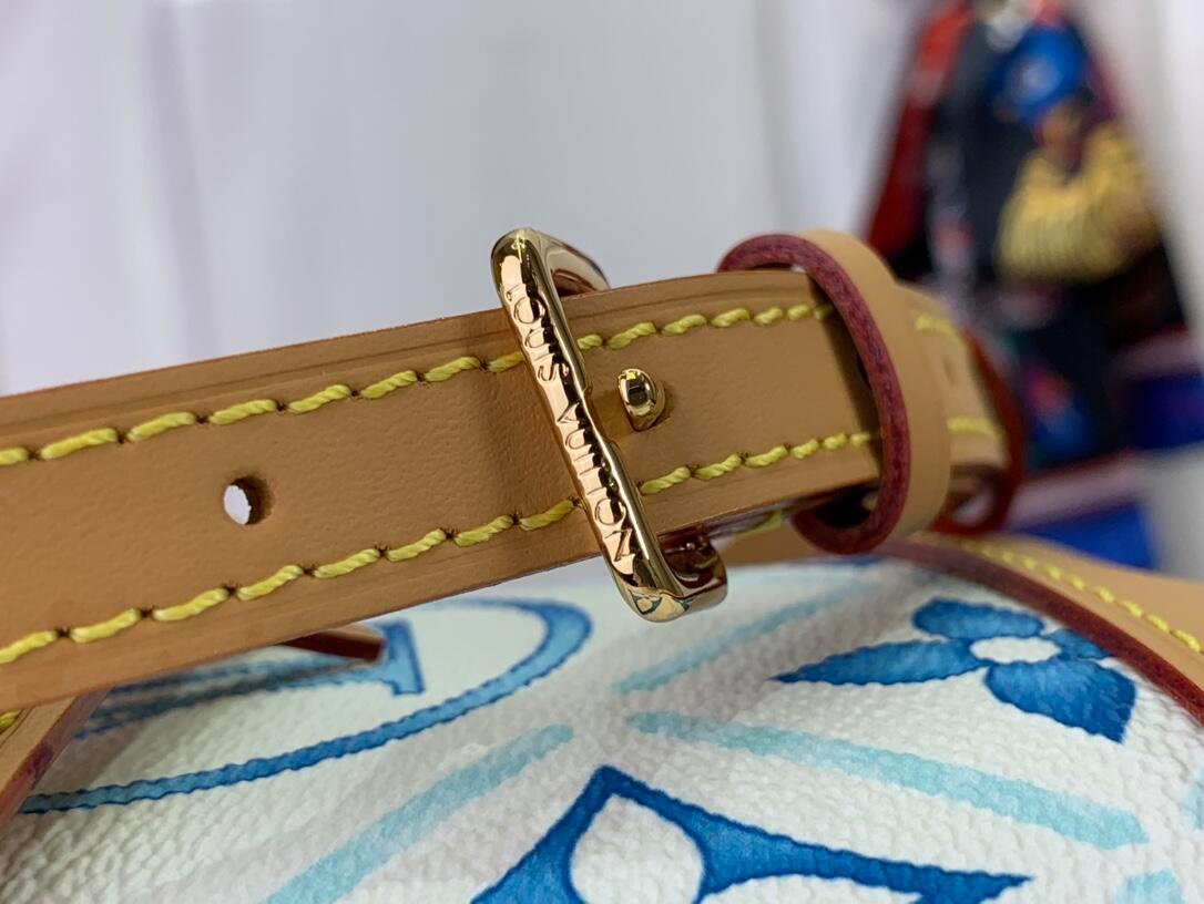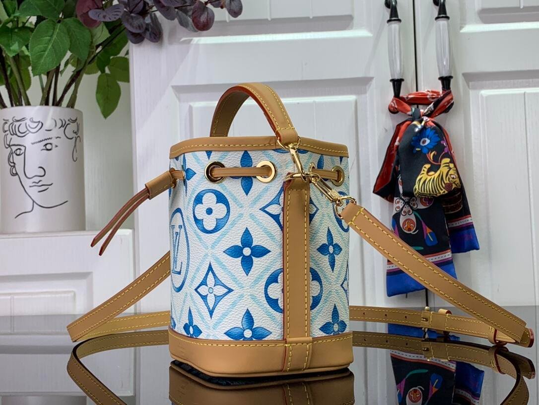 The Nano Noé bag is revisited with a Mediterranean-style Monogram Tiles print on coated canvas as part of the LV By the Pool collection, which evokes travel to sunny destinations. Leather trim complements this design, notably on the removable top handle and removable, adjustable shoulder strap, which offer different carry options.