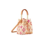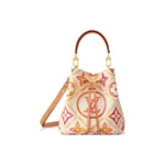 This adorable little bucket bag, the Néonoé BB in Monogram Tiles coated canvas, looks as good carried by hand as worn on the shoulder. The Monogram motif, treated in subtle nuances of pastel, features the LV Circle in the center of the bag. The printed textile lining pairs perfectly with the canvas pattern.