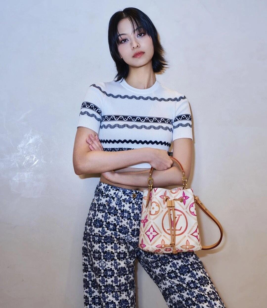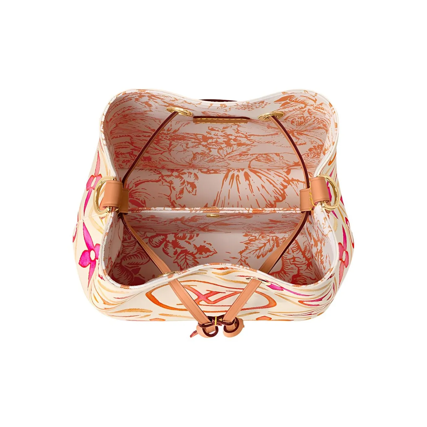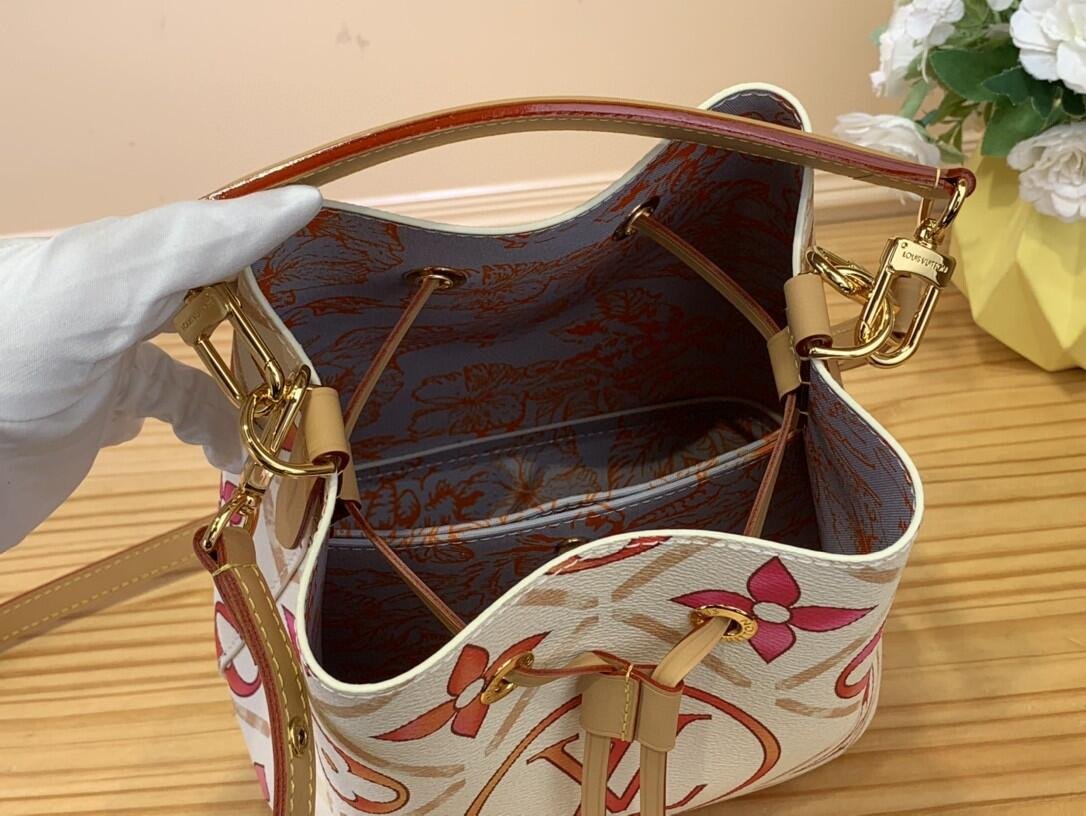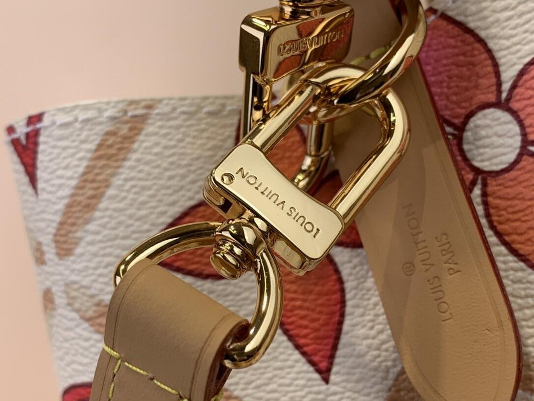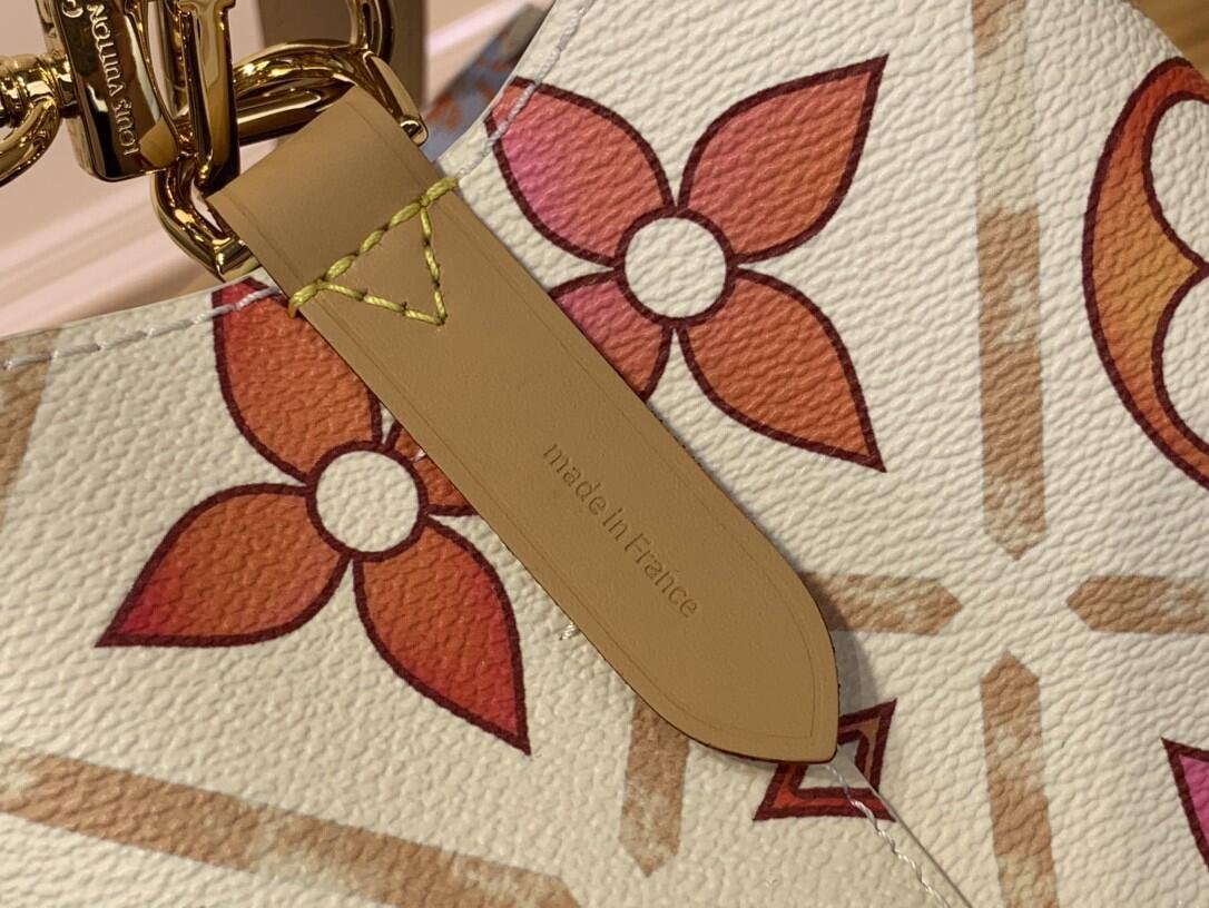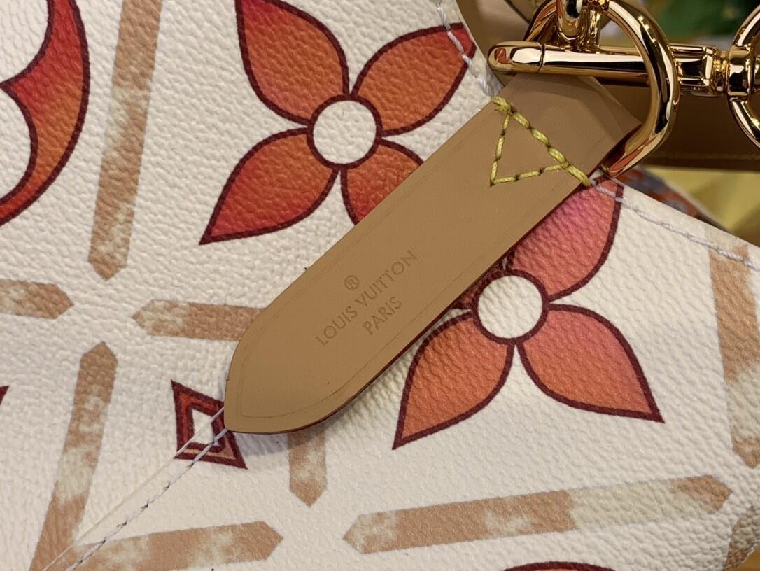 This adorable little bucket bag, the Néonoé BB in Monogram Tiles coated canvas, looks as good carried by hand as worn on the shoulder. The Monogram motif, treated in subtle nuances of pastel, features the LV Circle in the center of the bag. The printed textile lining pairs perfectly with the canvas pattern.