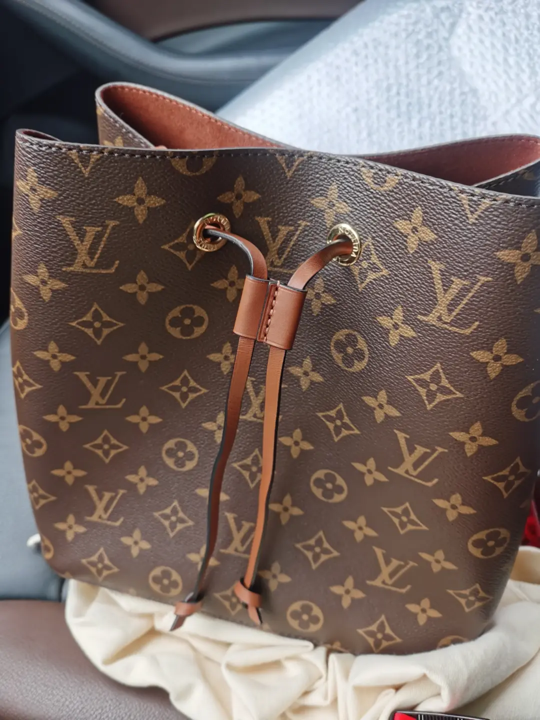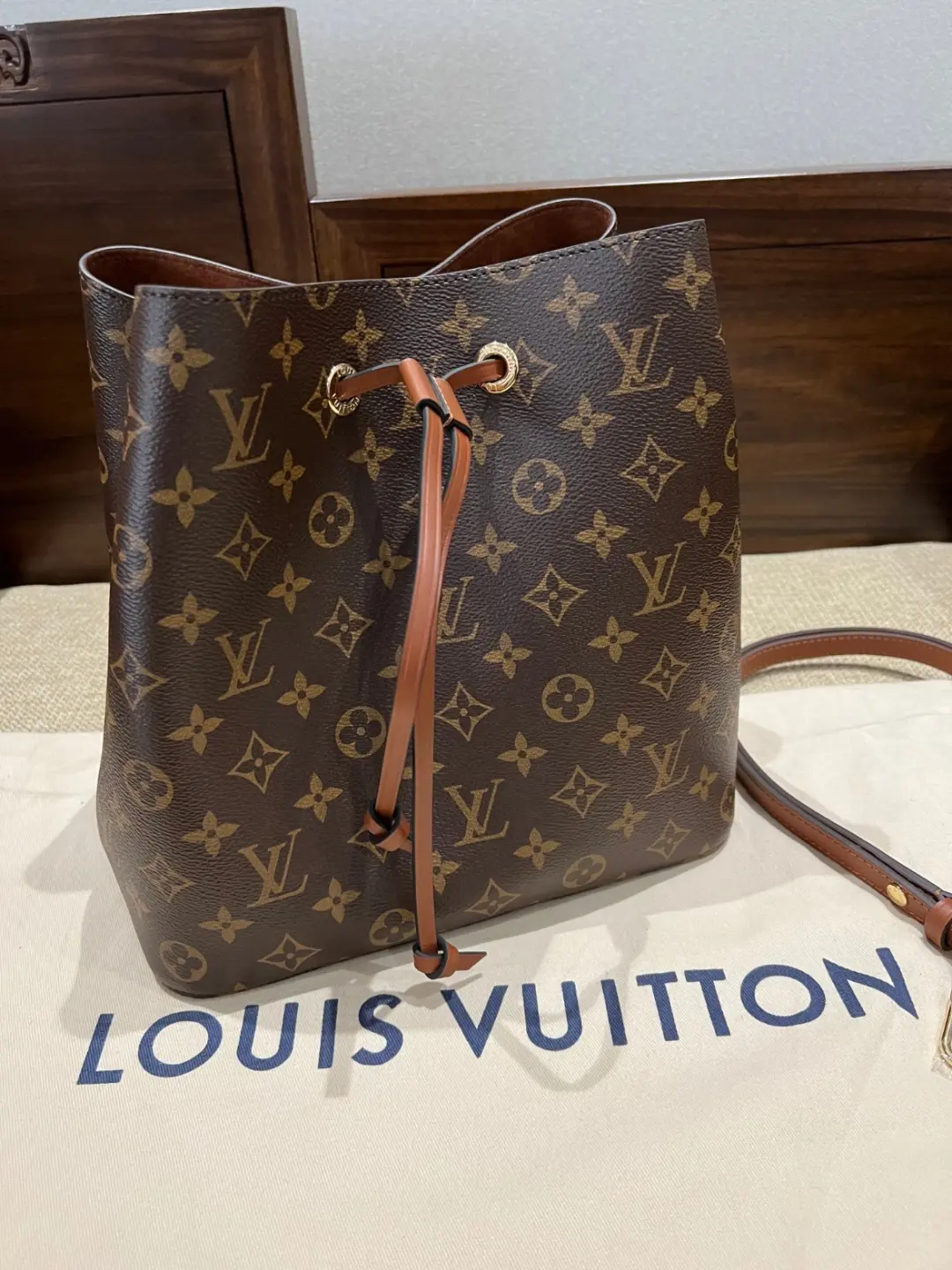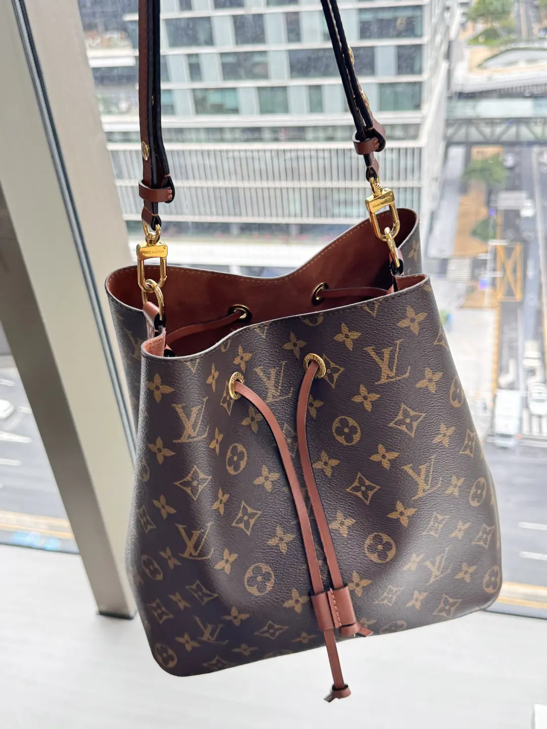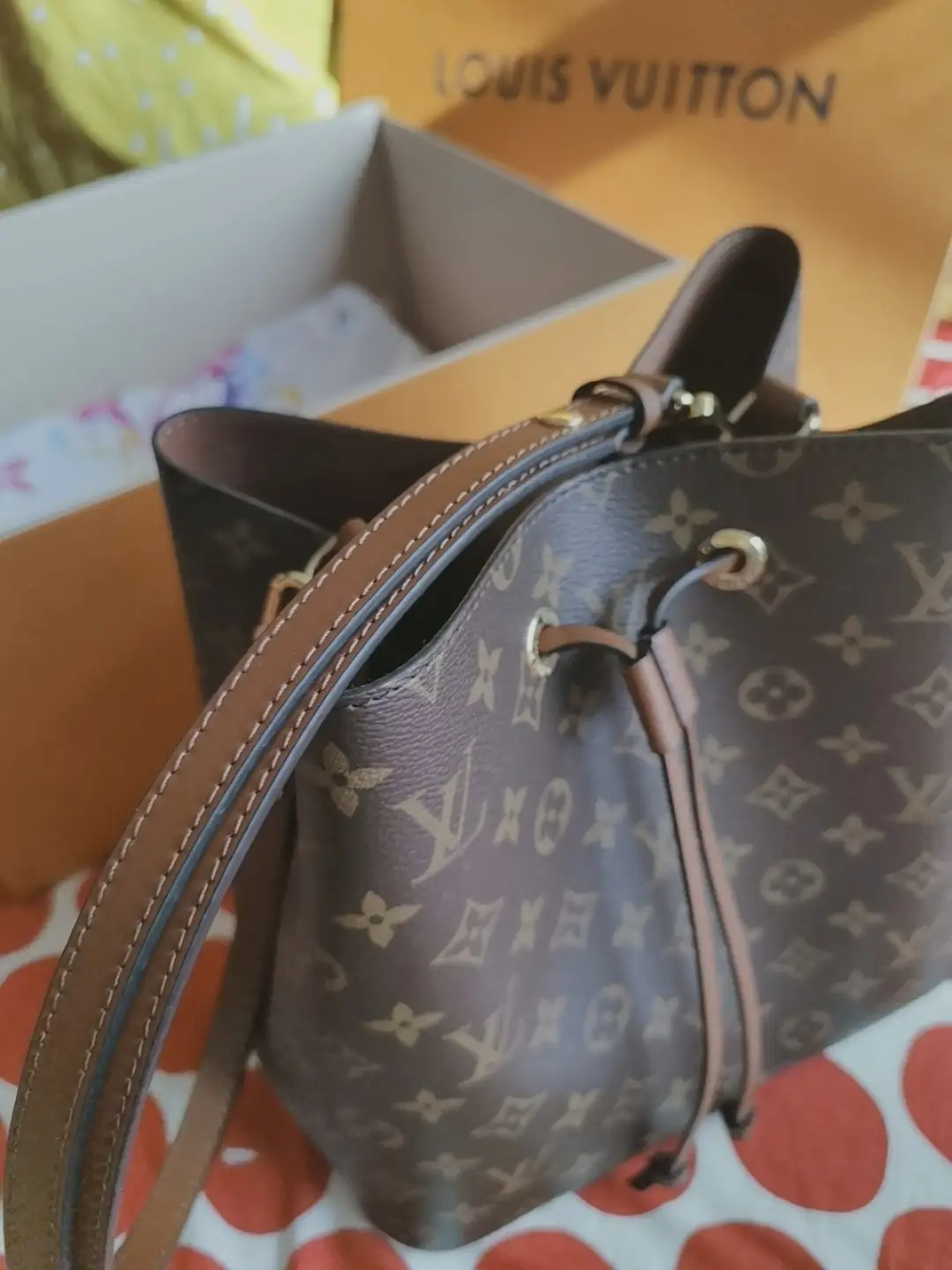 A true House icon, the NéoNoé bucket bag revisits a 1932 design by Gaston-Louis Vuitton. The original was created to transport bottles of Champagne in style; this modern version in Monogram canvas features a sleek shape, colorful leather trim and a matching bonded lining. The adjustable smart strap can be slung over the shoulder or lengthened for a trendy cross-body carry.