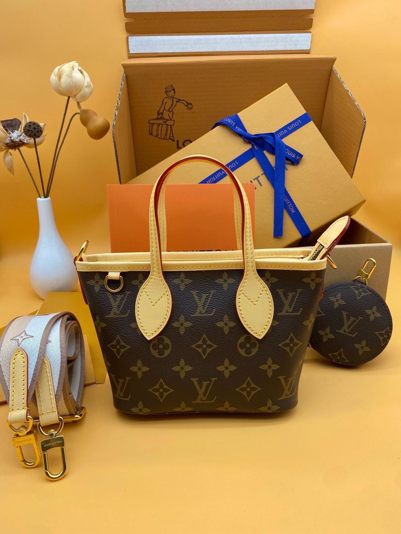 This season the House’s forever favorite, the Neverfull, gets reinvented as a mini-tote: the Neverfull BB handbag. This scaled-down version features an adjustable and detachable textile strap as well as a playful coin purse attached to a D-ring. It is just the right size for small essentials like a smartphone and compact wallet.