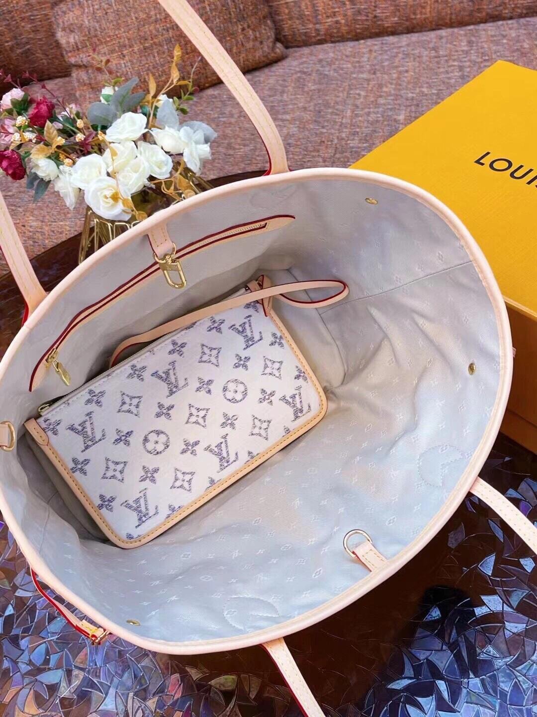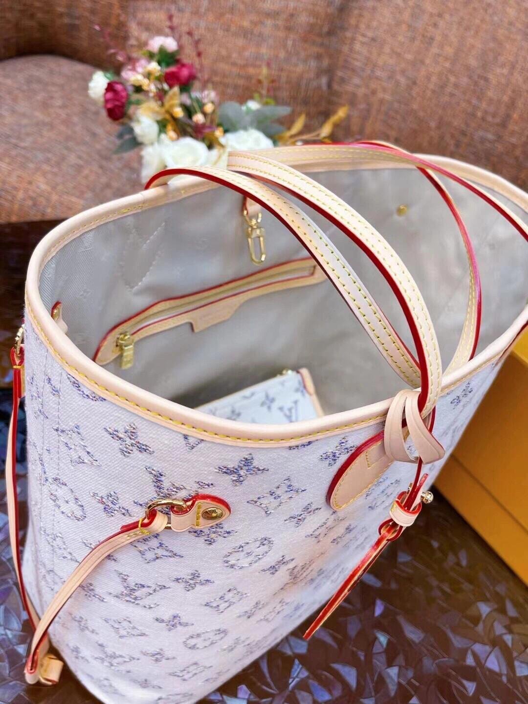 The Louis Vuitton Neverfull MM Handbag (Model: M24905) is a classic tote style from the brand, crafted from Monogram Jacquard canvas and featuring an adjustable shoulder strap, suitable for daily use or short trips.