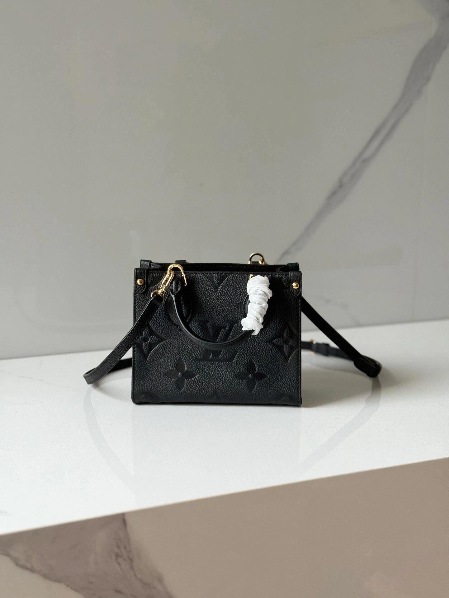 The OnTheGo BB is an on-trend micro-bag fashioned from Monogram Empreinte leather, with Monogram embossing. This tiny tote boasts all details of the full-size model – including the distinctive handle mounts and riveted leather tabs on the corners – and can fit a smartphone and compact wallet. A removable and adjustable strap enables shoulder carry.