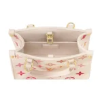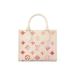 Part of the Sunrise Aquarelle collection, this OnTheGo BB handbag is fashioned from Monogram Empreinte leather in a colorway of orange, pink and fuchsia, inspired by sunrise. The LVs and Monogram Blossoms printed on the leather have a watercolor aspect. A hint of glossiness is screen-printed onto the surface, like glistening drops of morning dew. Two rolled-leather top handles and a removable and adjustable strap enable various carry options.