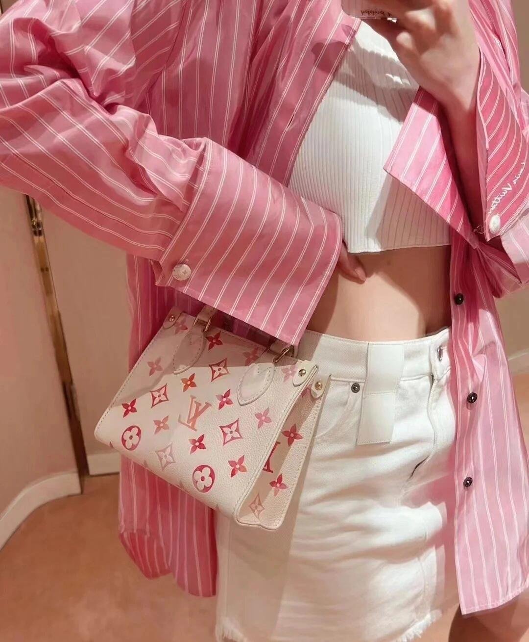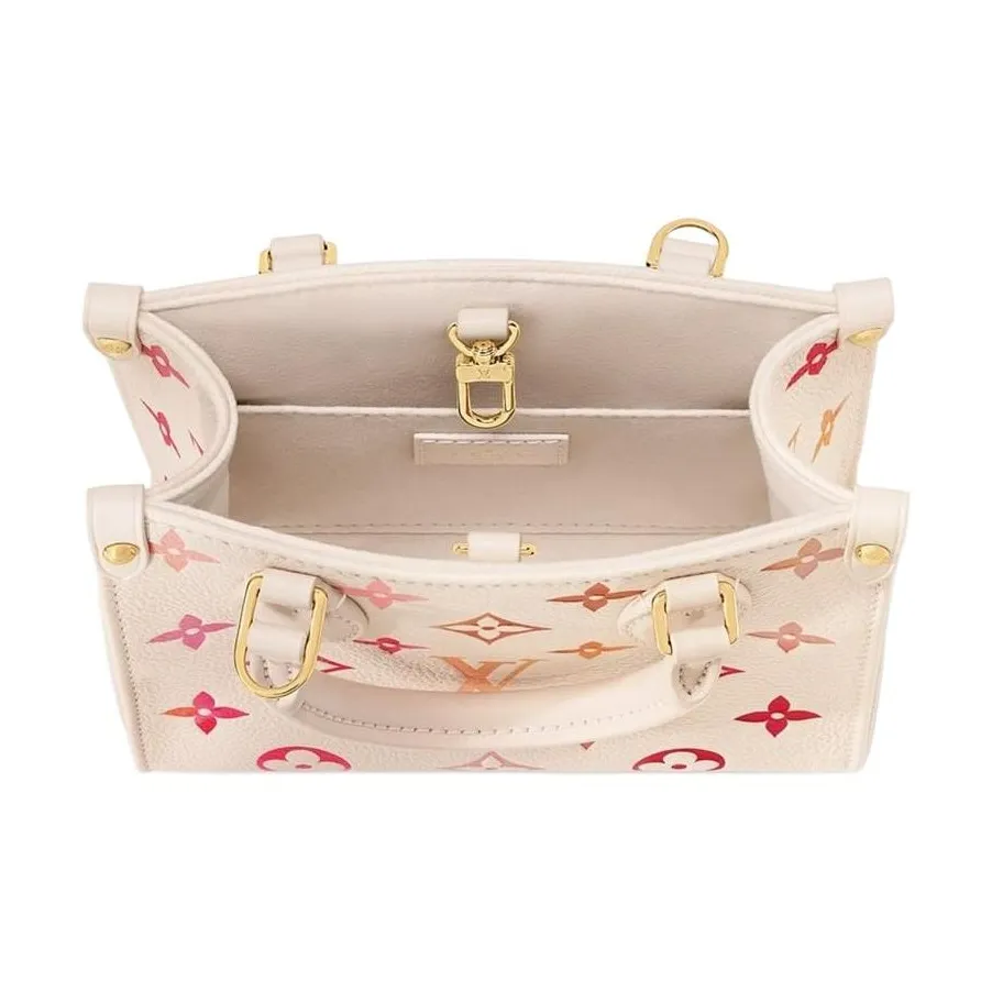 Part of the Sunrise Aquarelle collection, this OnTheGo BB handbag is fashioned from Monogram Empreinte leather in a colorway of orange, pink and fuchsia, inspired by sunrise. The LVs and Monogram Blossoms printed on the leather have a watercolor aspect. A hint of glossiness is screen-printed onto the surface, like glistening drops of morning dew. Two rolled-leather top handles and a removable and adjustable strap enable various carry options.