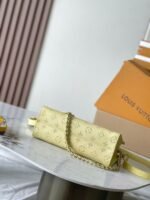 The elegantly elongated silhouette, exquisite calf leather, and subtle pale-yellow colorway all come together to make this OnTheGo East West bag truly eye-catching. It’s signed with a Monogram Flower name tag attached to the handle. Two articulated top handles and a removable chain-and-leather strap give carry options.