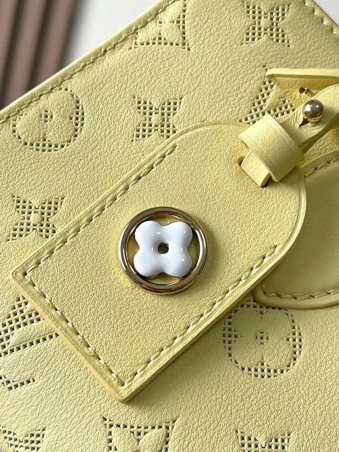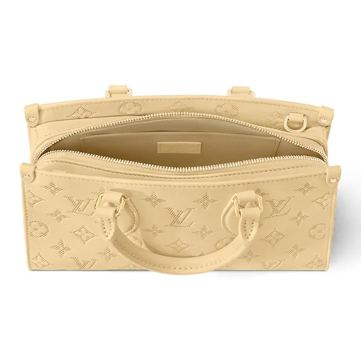 The elegantly elongated silhouette, exquisite calf leather, and subtle pale-yellow colorway all come together to make this OnTheGo East West bag truly eye-catching. It’s signed with a Monogram Flower name tag attached to the handle. Two articulated top handles and a removable chain-and-leather strap give carry options.