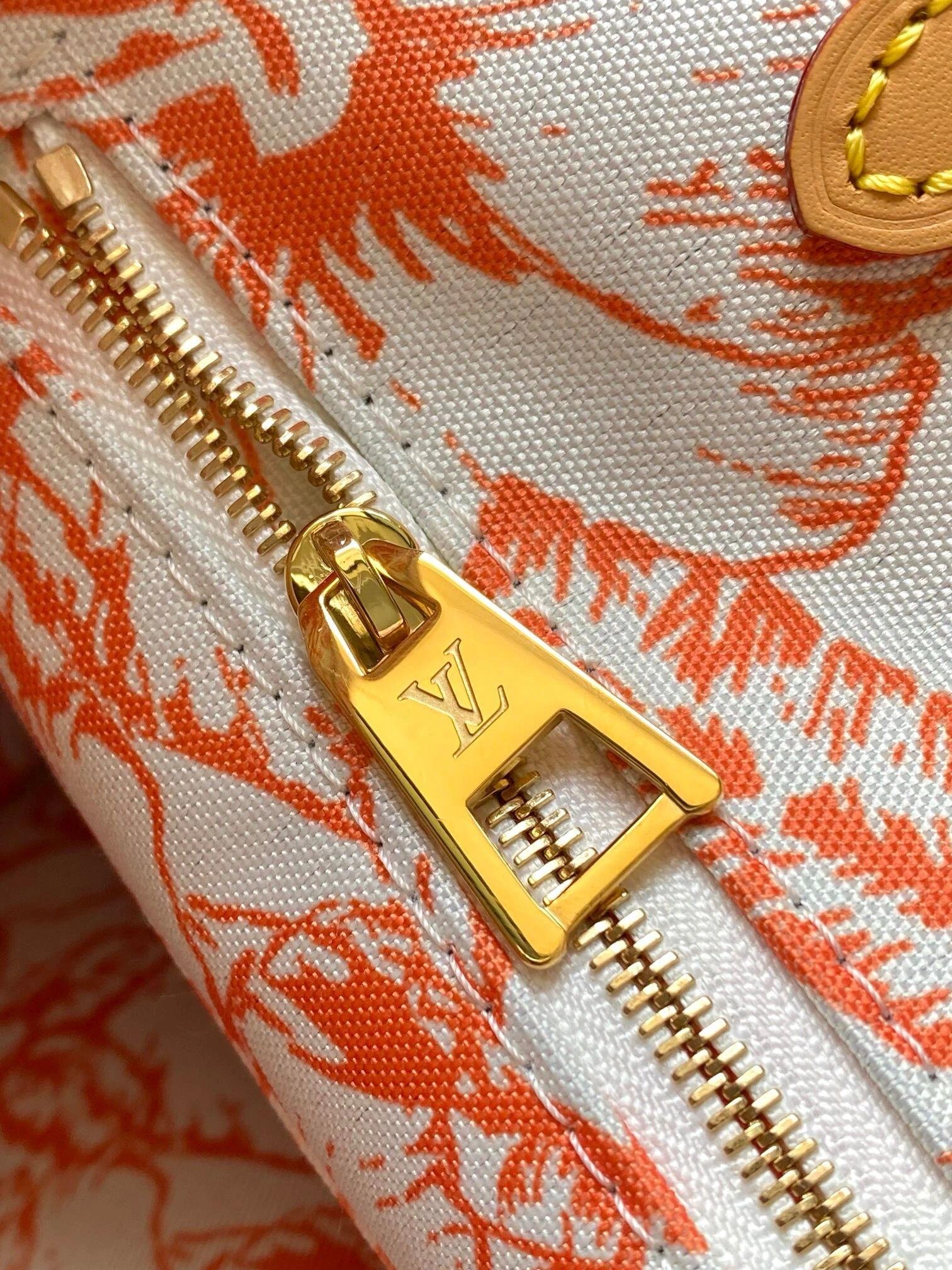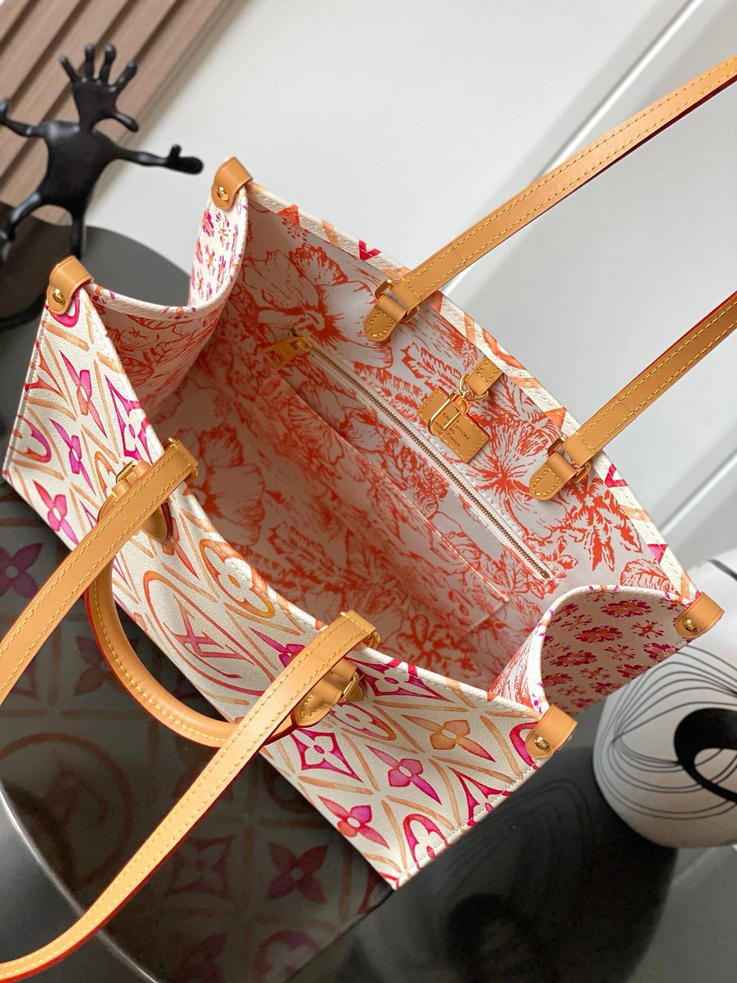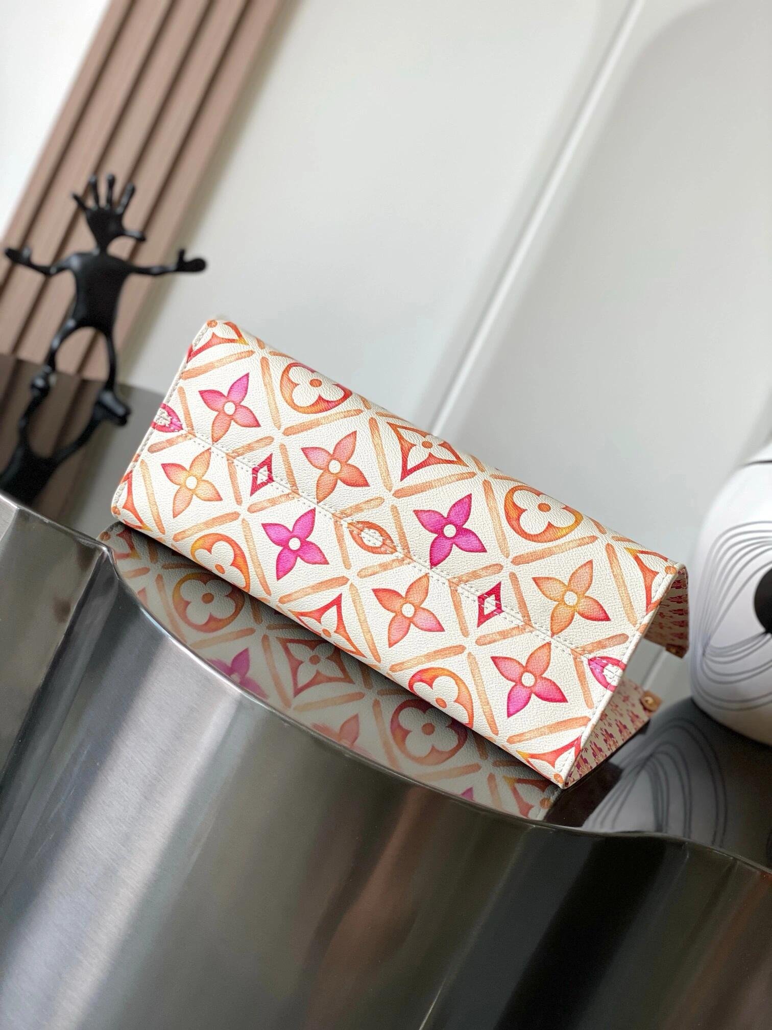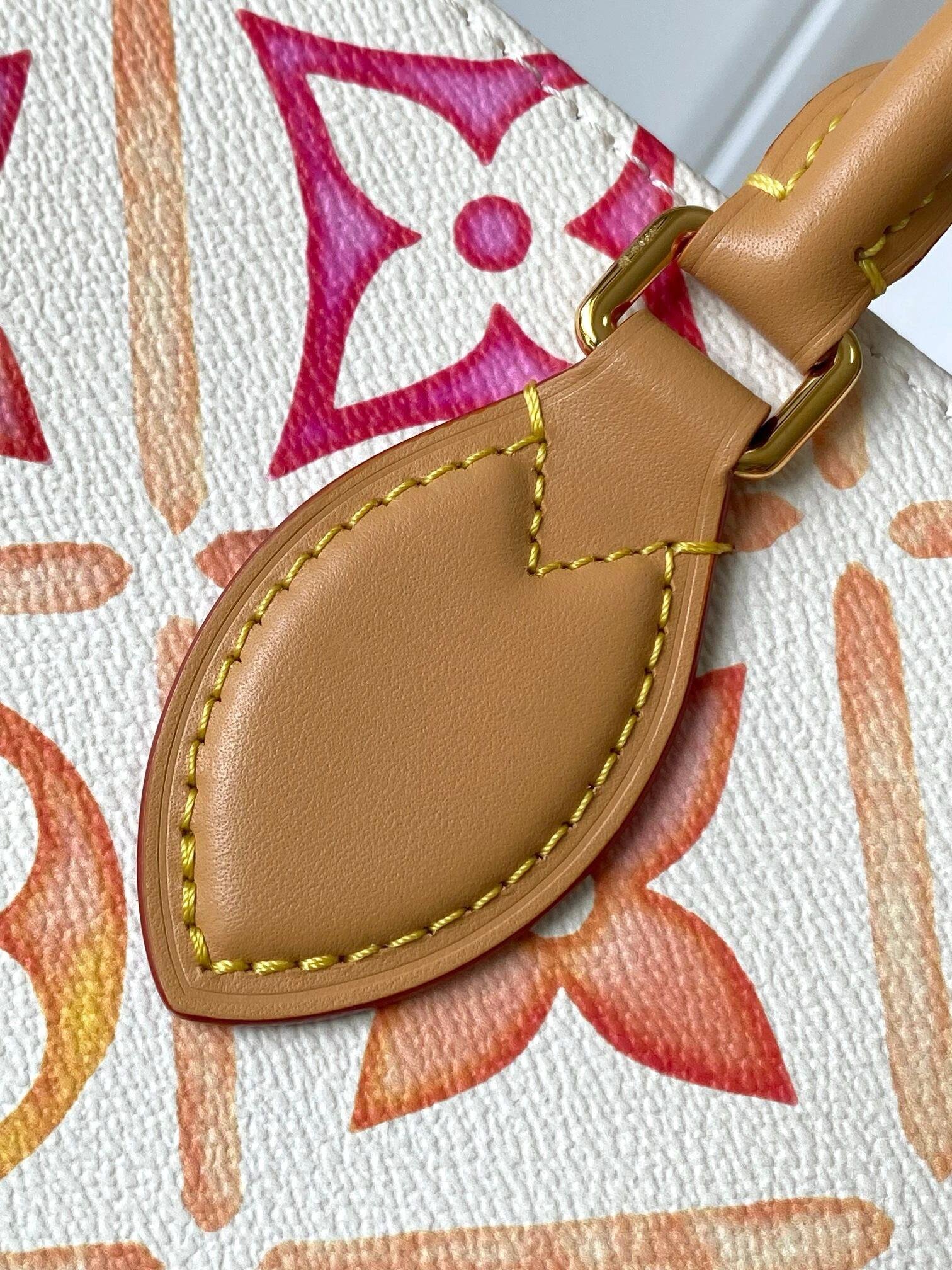 This OnTheGo MM tote is made from Monogram Tiles canvas, with its watercolor-style Monogram print and LV Circle centered on the bag. The two top handles, and concealed shoulder straps, are in cowhide leather, as are the four riveted corner tabs. This roomy bag can easily carry a laptop as well as other daily necessities.