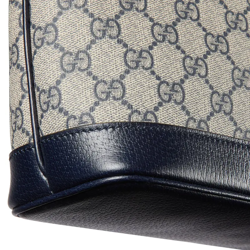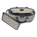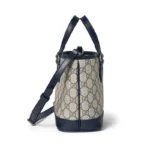 The Ophidia line is further elevated through new sizes and styles, like this small tote bag which has a detachable pouch and detachable leather shoulder strap, allowing for versatile wear. The beige and blue GG Supreme is complete with light gold-toned Double G hardware.
