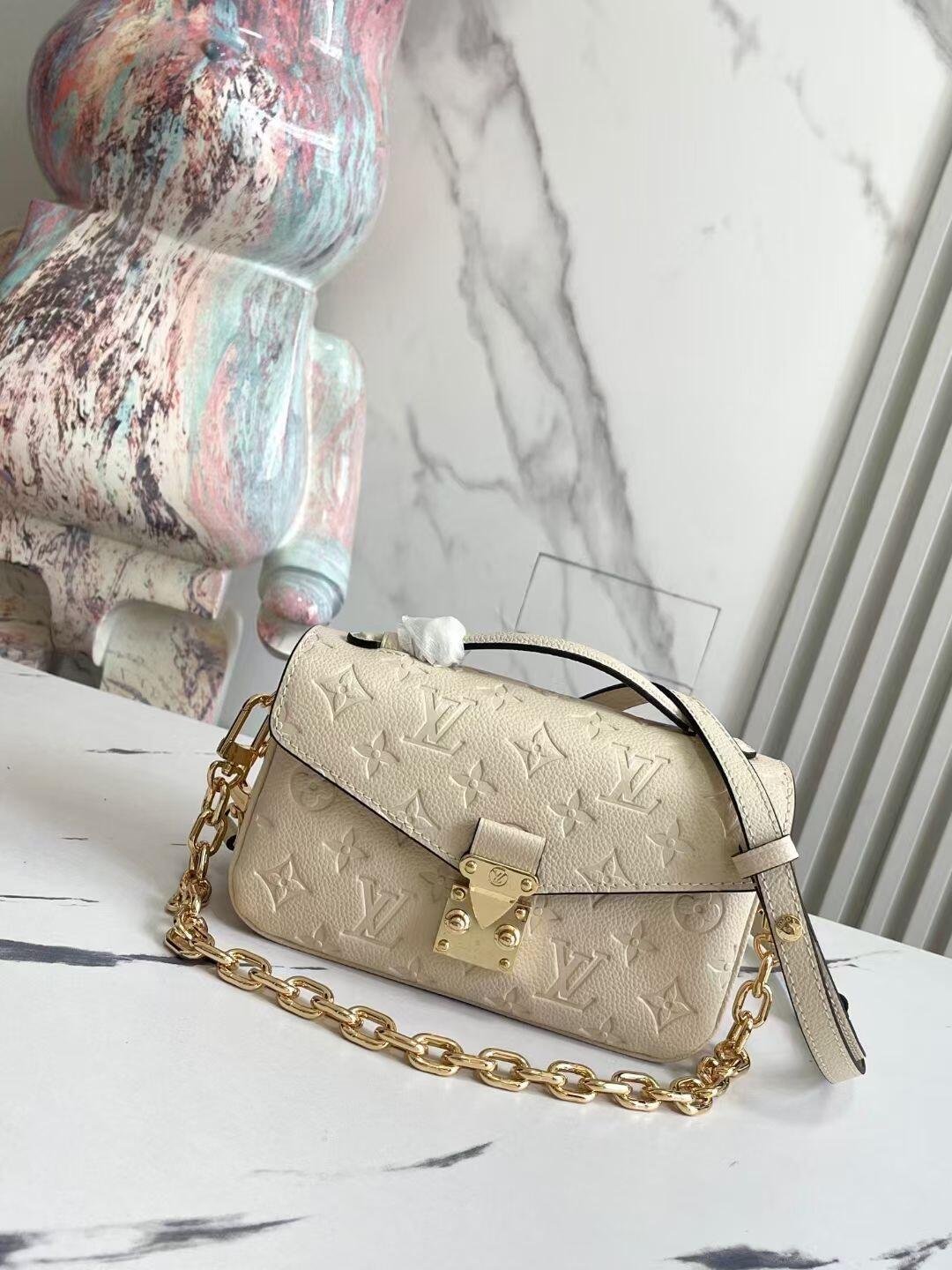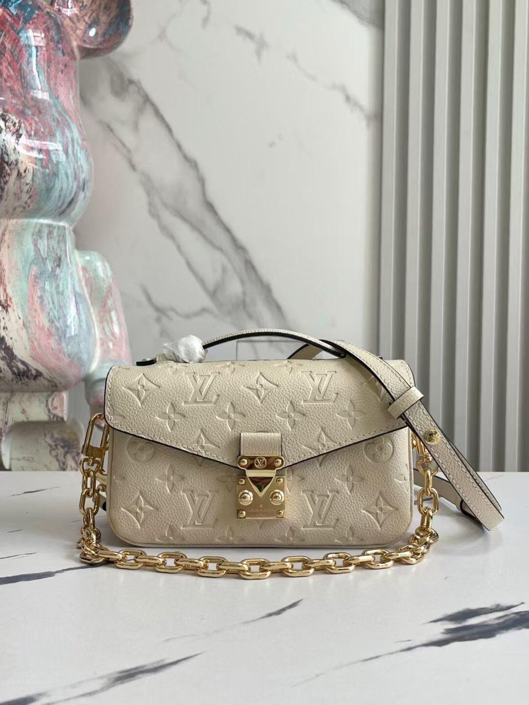 Made from embossed Monogram Empreinte leather, the Pochette Métis handbag blends signature House style and contemporary detailing. The on-trend East-West silhouette is highlighted by a heritage S-lock and removable short chain, both cast from gold-finish metal. With its well-organized interior and adjustable smart strap, this compact bag adapts perfectly to active lifestyles.