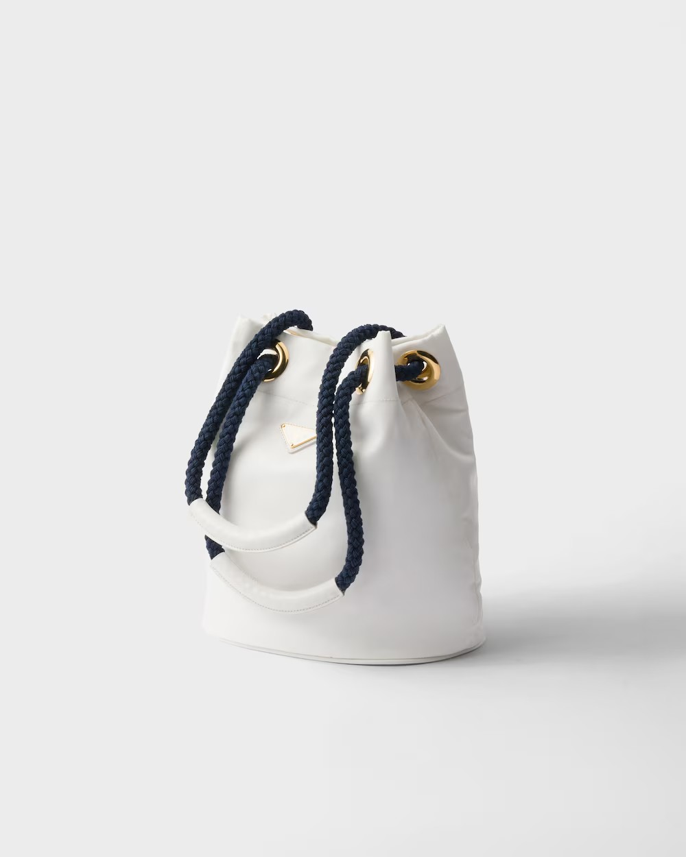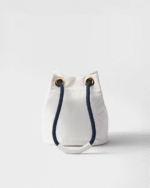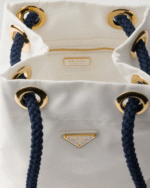 Unusual combinations animate this Re-Nylon bag inspired by the timeless codes of nautical style. Sliding cord handles underline the versatile character of the accessory that can be worn carried by hand or over the shoulder, completed by the enameled metal triangle logo. For sustainable care to preserve the product’s characteristics and reduce microfiber shedding, we recommend not washing the item too often. Let the product air out after every use and have it dry cleaned at a specialized ecological dry cleaners.