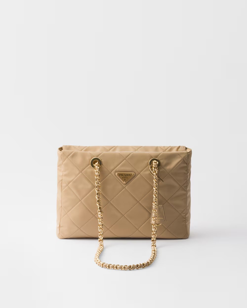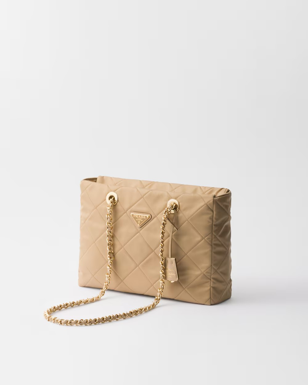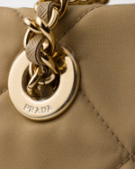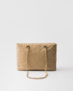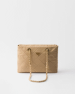 This tote bag with timeless charm, a re-edition of an archive design, summarizes Prada codes in a sophisticated and pragmatic silhouette. The style with soft volumes is made of Re-Nylon, an innovative fabric made of regenerated nylon, the sustainable evolution of a distinctive material of the brand. Elegant leather-threaded metal chain handles complete the accessory with vintage charm, embellished with the iconic enameled metal triangle logo. For sustainable care to preserve the product’s characteristics and reduce microfiber shedding, we recommend not washing the item too often. Let the product air out after every use and have it dry cleaned at a specialized ecological dry cleaners.